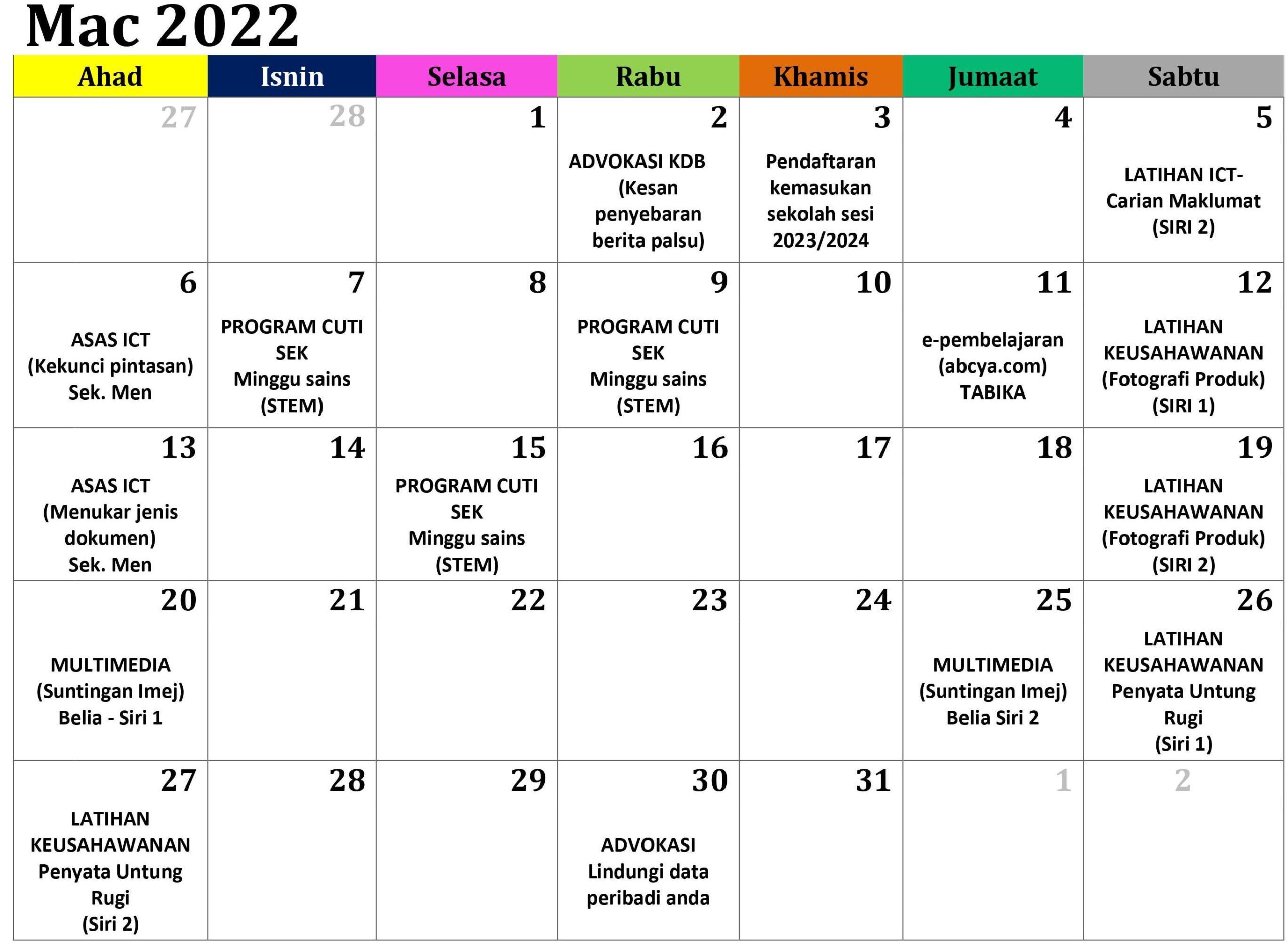 JADUAL AKTIVITI BULAN MAC 2022
