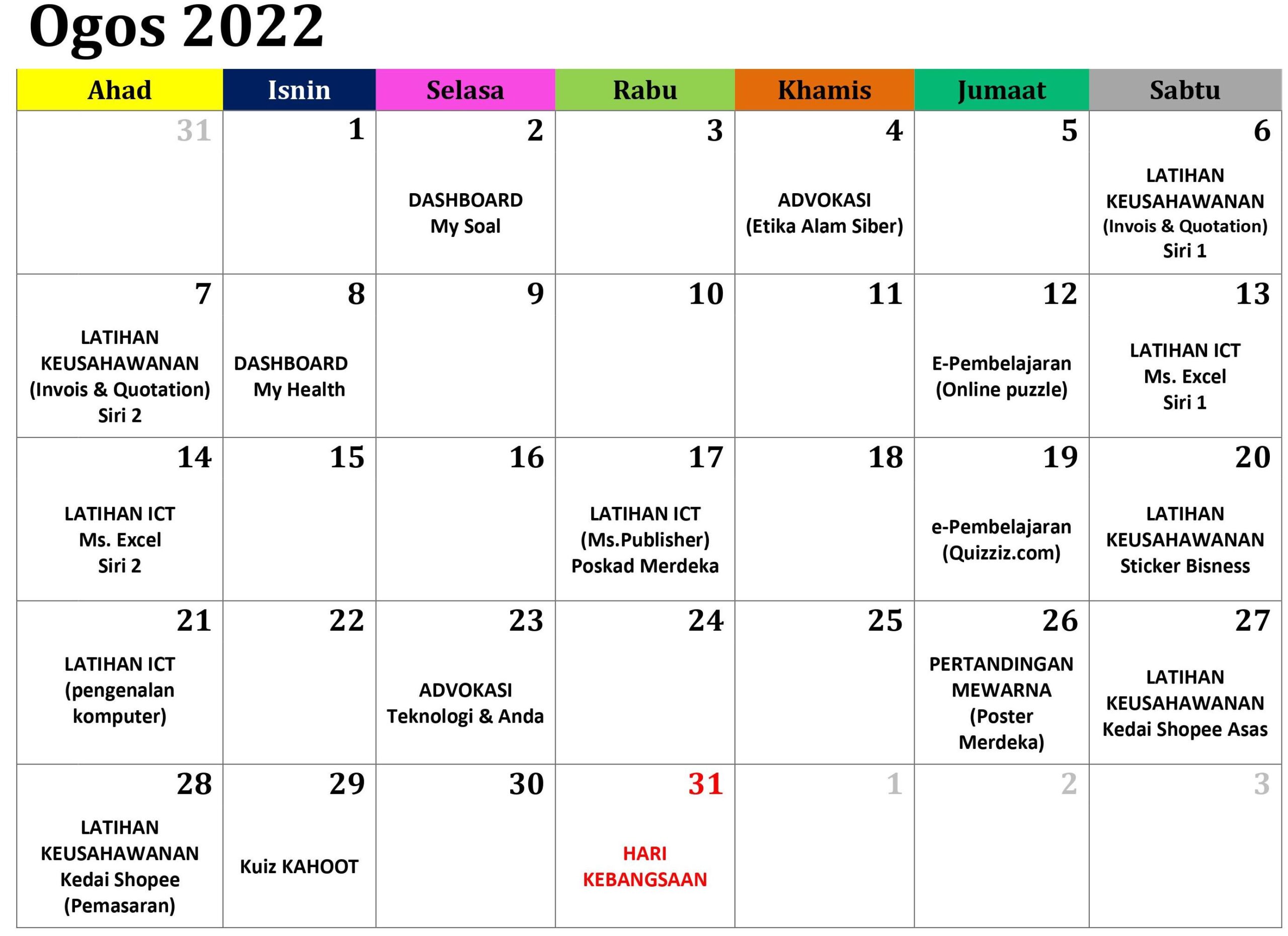 JADUAL AKTIVITI BULAN OGOS 2022