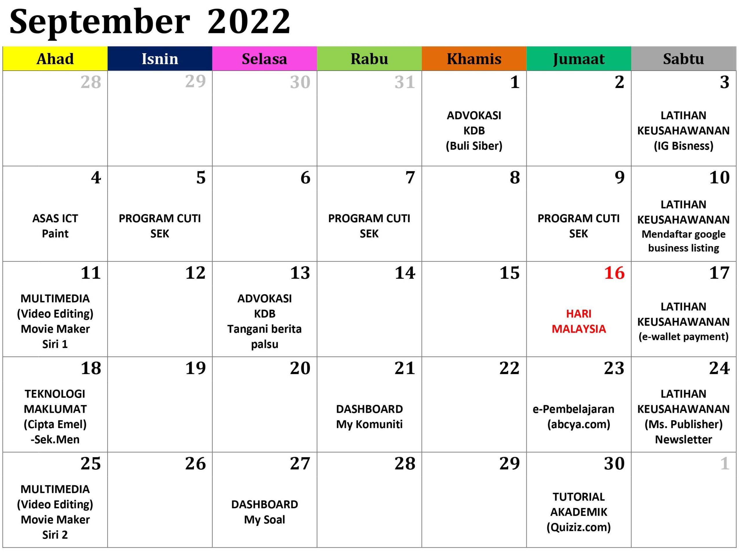 JADUAL AKTIVITI BULAN SEPTEMBER 2022