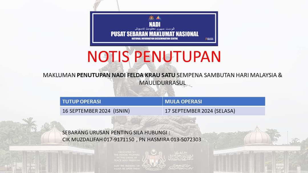 Assalamualaikum Dimaklumkan NADI Felda Krau 1 akan di tutup selama 1 hari seperti ketetapan yang berikut :