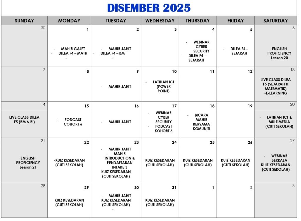 JADUAL AKTIVITI BULAN DISEMBER 2025